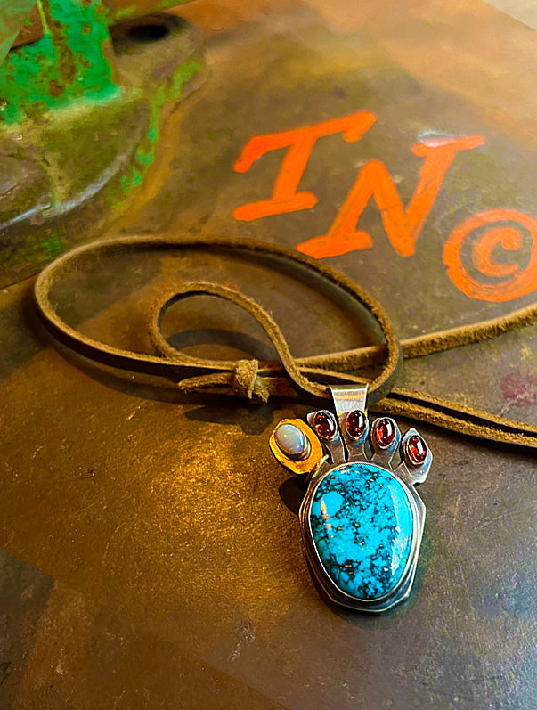 Sterling bones, moonstone fire, turquoise road dust. One-of-one.