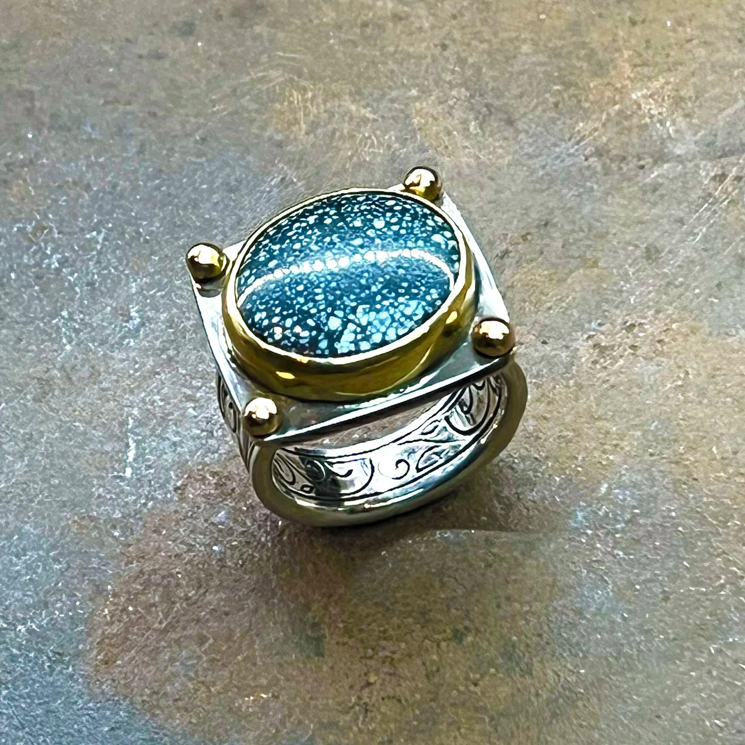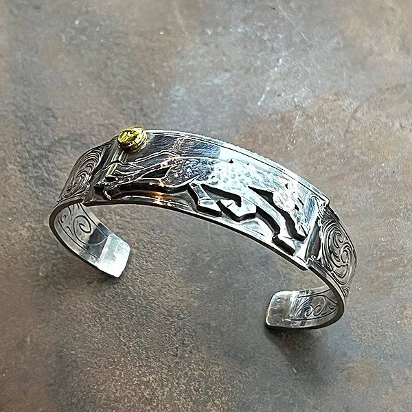Engraved silver with a mind of its own. Turquoise riding the top. One-of-one.