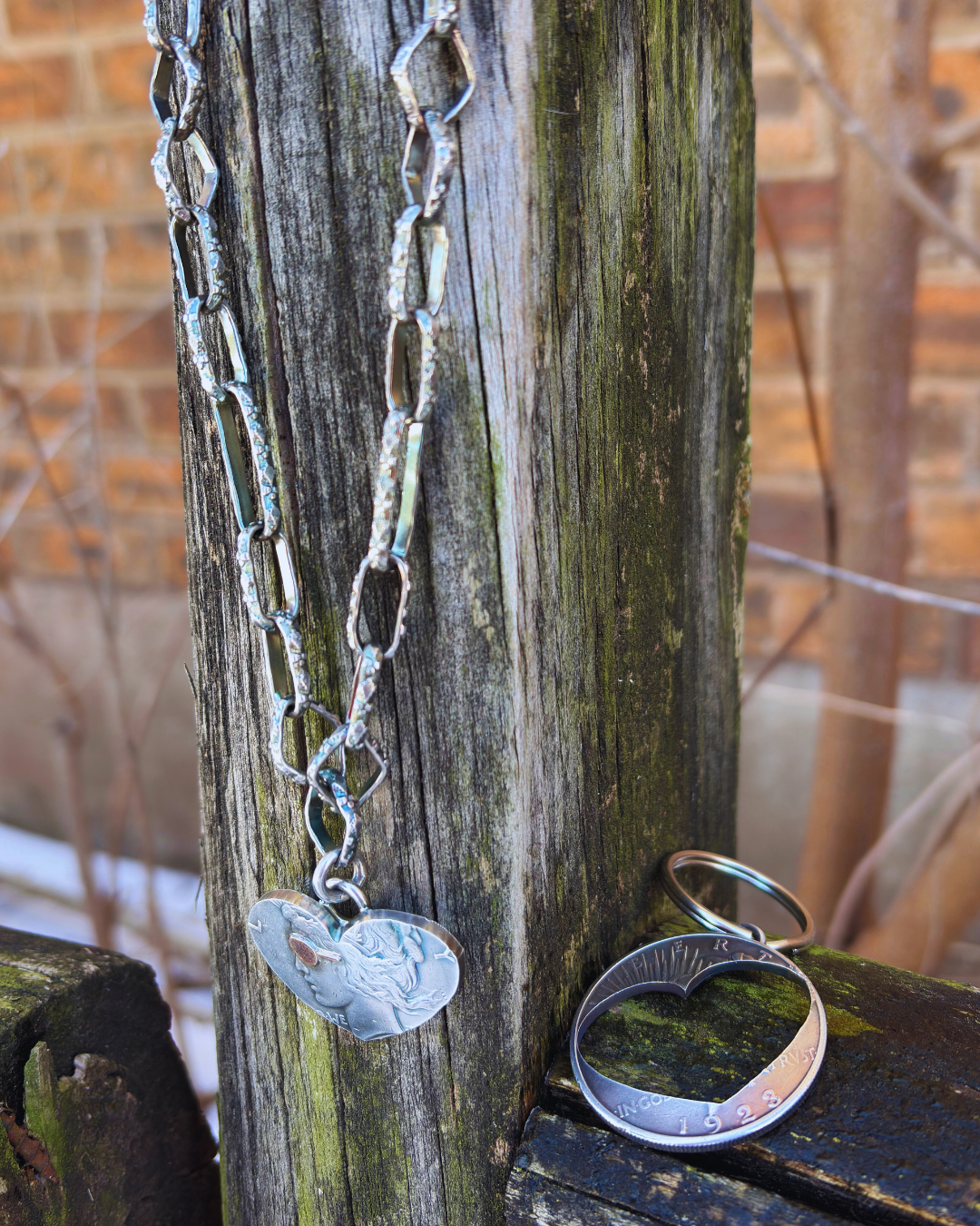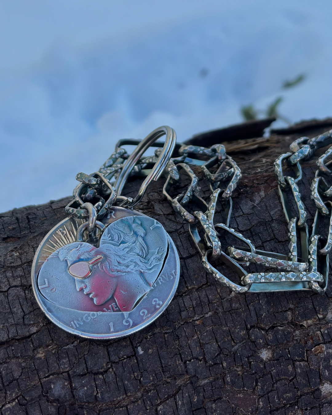 Handmade in 1.75 troy ounces of silver, this piece is cut from a single authentic Peace dollar. The outer coin is formed into a heart pendant, while the original center cut-out is repurposed into a matching keychain.